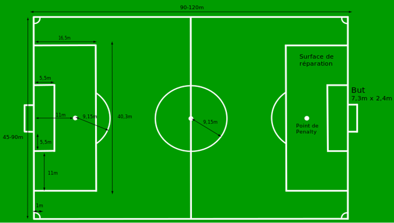 Un match de football comporte deux périodes de 45 minutes, entrecoupées d'une mi-temps ne devant pas excéder quinze minutes.